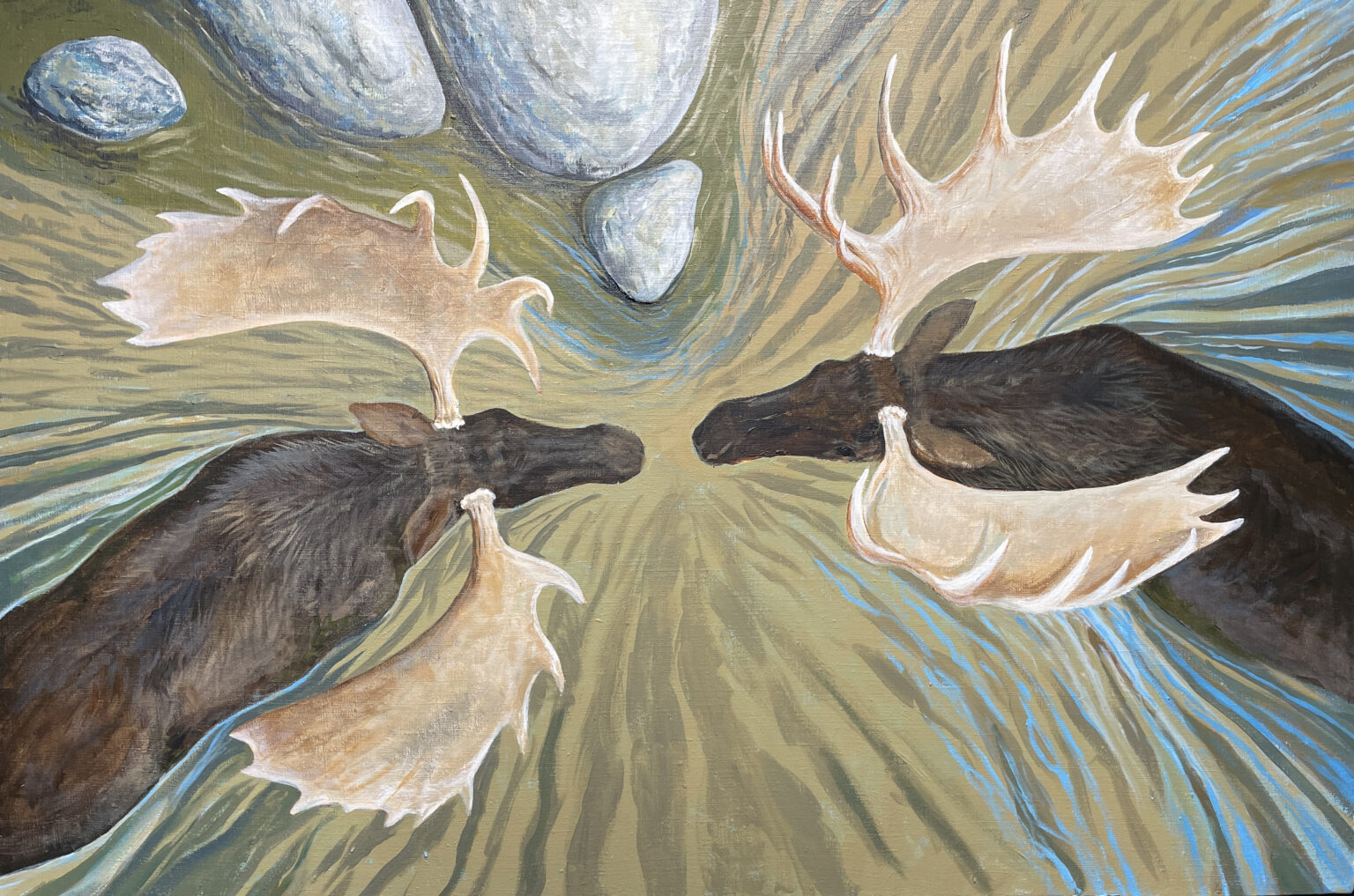 The two moose are both mature bulls with newly-polished antlers, and they are spoiling for a fight. If they were not in the water, they would already be escalating their conflict. For now they’re displaying their antlers to each other to see if one or the other will back down.