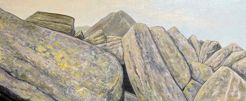 This painting, titled “Stay on the Marked Trail!”, depicts the Knife Edge trail on Maine’s tallest peak, Katahdin. What’s over the next peak?